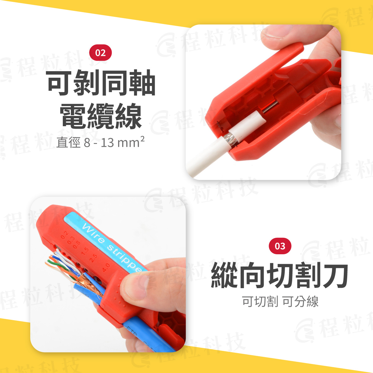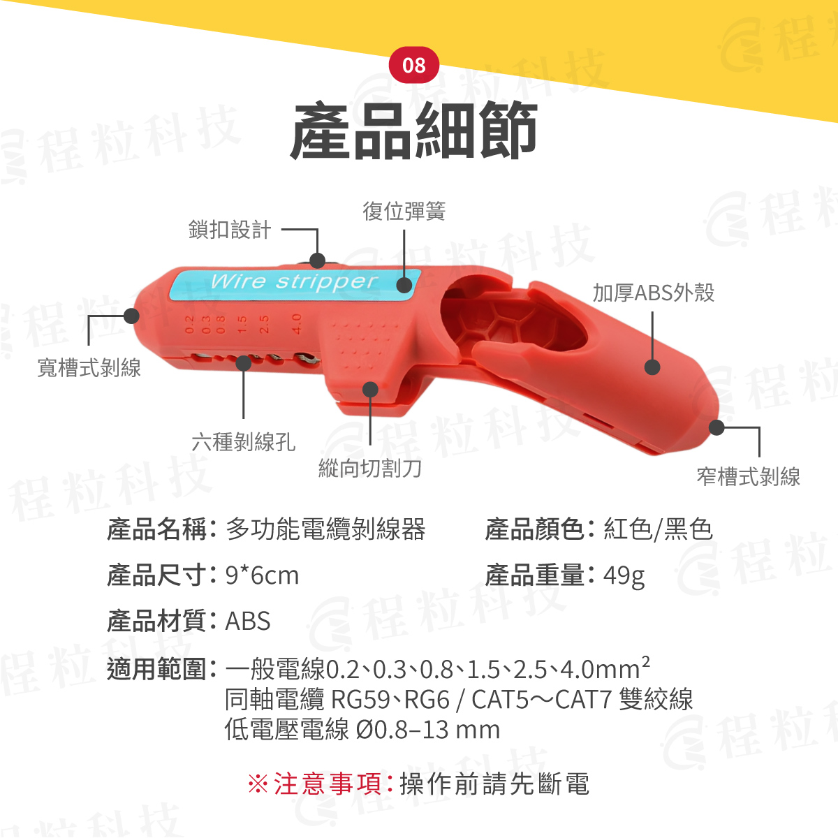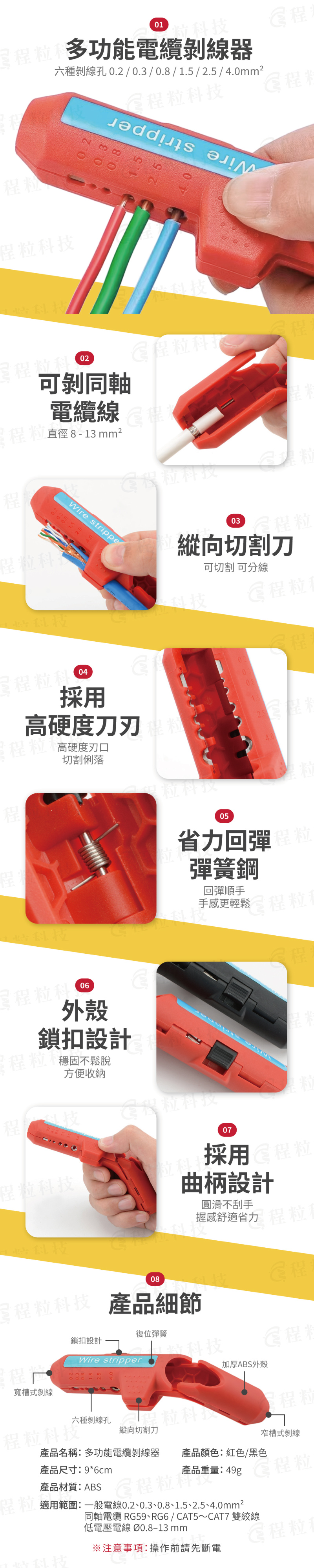 | 適用範圍 | 一般電線:0.2、0.3、0.8、1.5、2.5、4.0mm² 同軸電纜:RG59、RG6 / CAT5~CAT7 雙絞線 低電壓電線:Φ0.8~13mm |