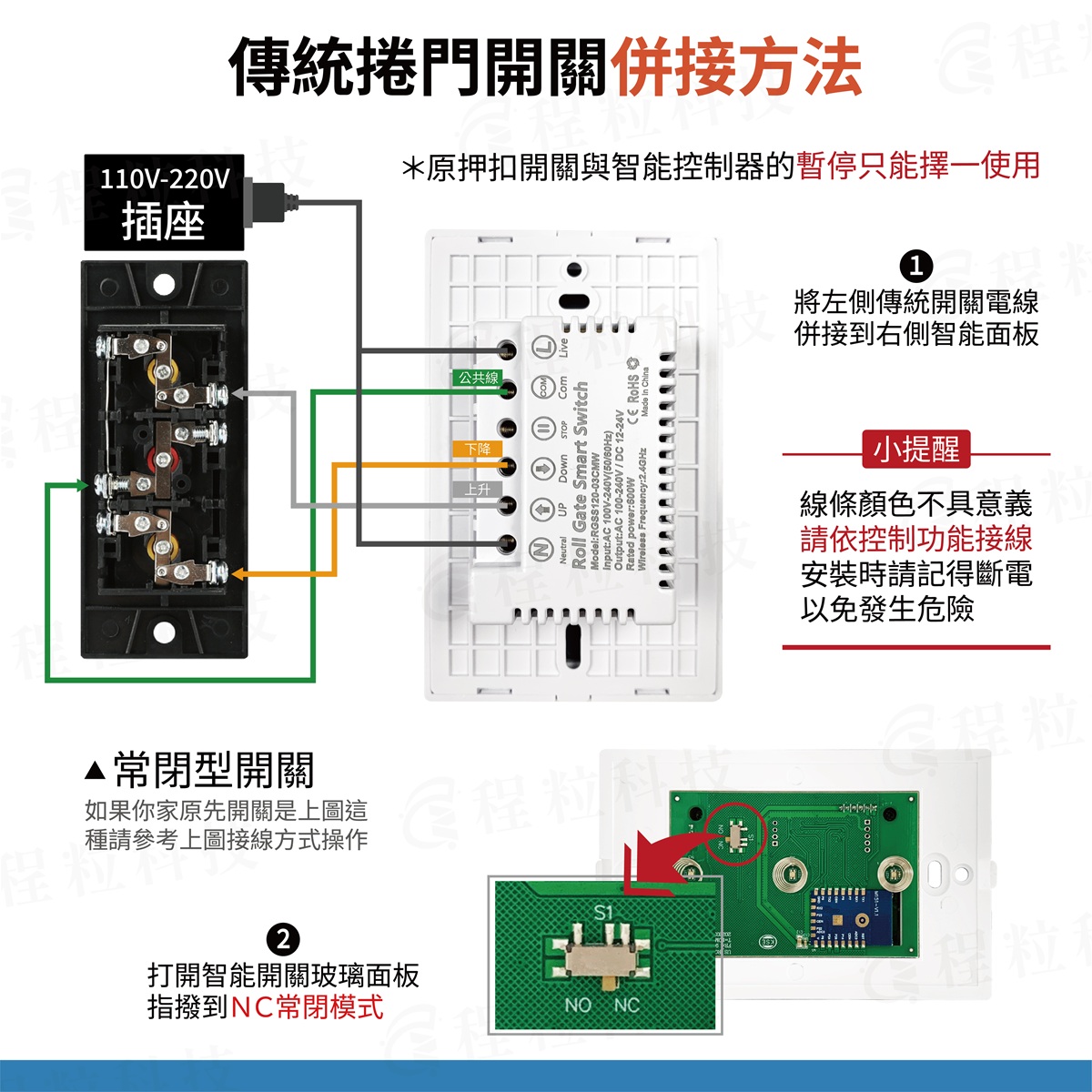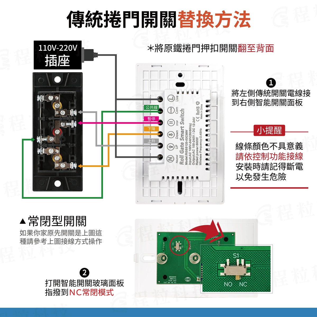 1.拆卸下原押扣開關的控制線,對應說明書分別將上、停、下、共線(COM)接上智能面板對應位置