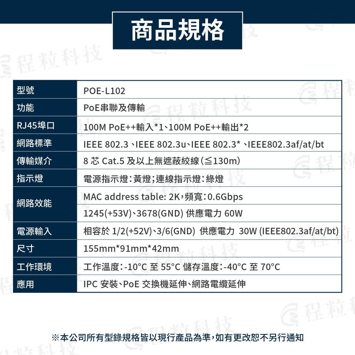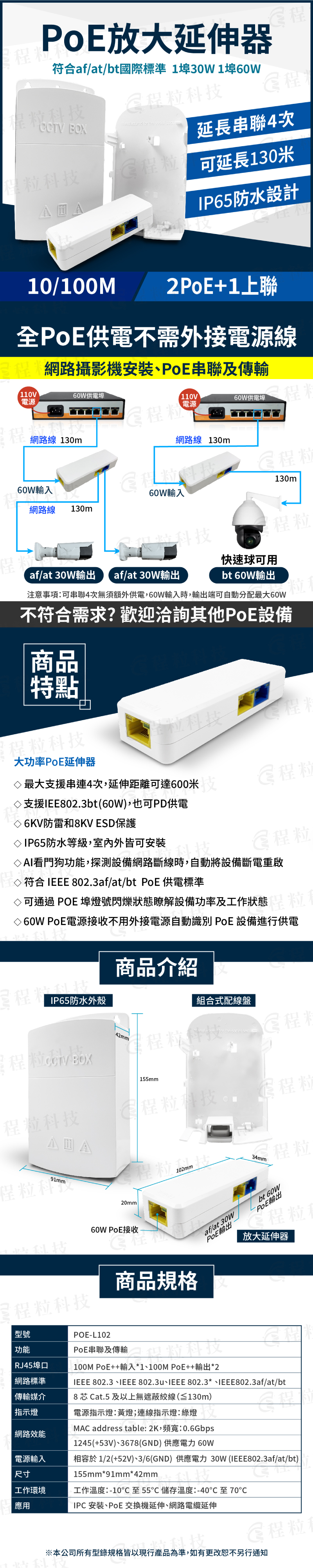 RJ45埠口 | 100M PoE輸入*1、輸出*2 |